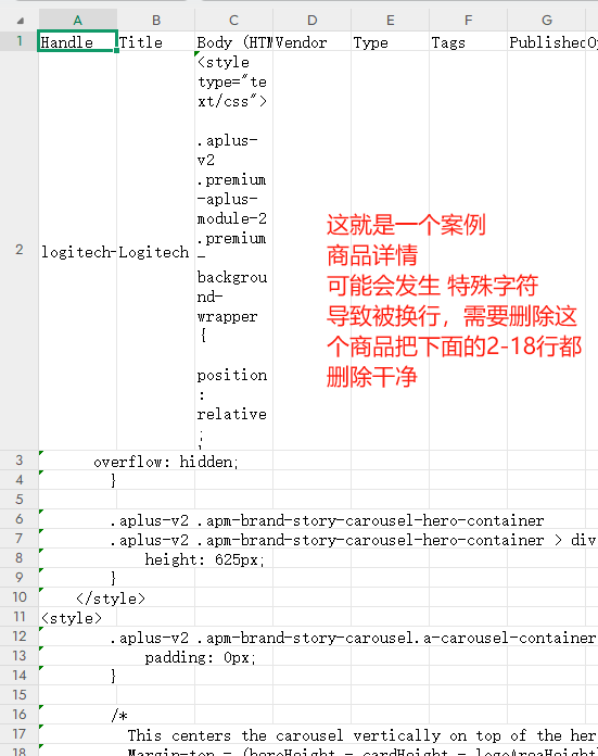 为何会有错误行的数据,因为csv对特殊符号的兼容性比较差,可能存在商品描述,存在特殊符号,导致他一个单元格存进去,自动给溢出,并换行了。就会导致文件报错,或者导入进去个数不对。