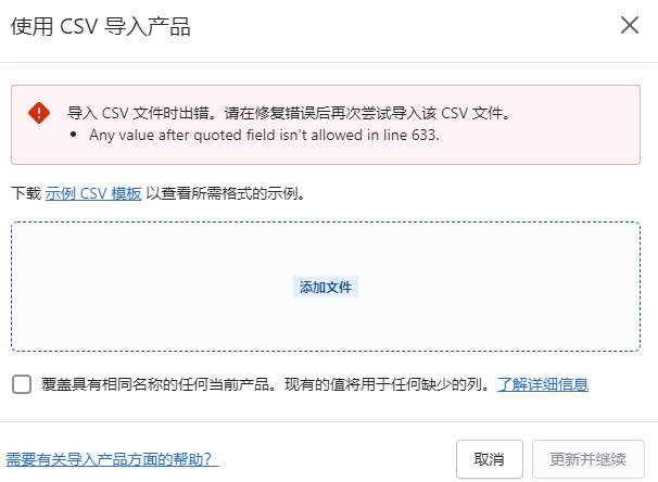 当你下载了CSV文件后,在你的独立站系统导入报错:
